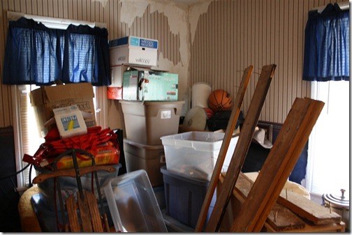 We have SO LITTLE storage in this house, we’ve been using this space to hold seasonal decor and other junk. So our first job is to clean it out.