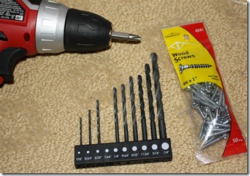 Next, I predrilled holes, using a drill bit that was slightly smaller than my screws. I used the 3/32nd one. And I used #6 1” wood screws (The #8s had too big of a head, FYI.)