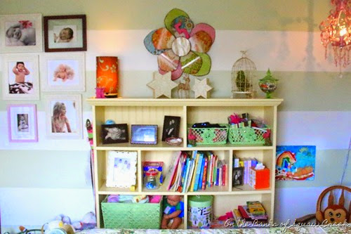 On the other side of the room, a custom bookcase holds toys and books for the sweet 5 year old.