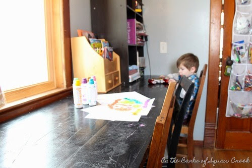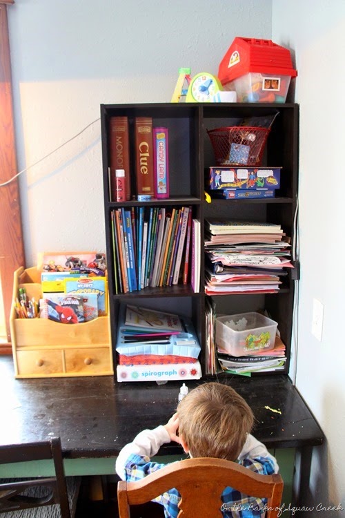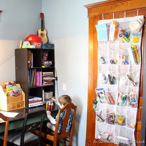 Speaking of art projects, we keep the art supplies close at hand on the back of the door that leads to the living room. This clear shoe organizer